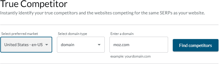 True Competitor pulls ranking keywords (by highest-volume) for any domain in our Keyword Explorer database — even your competitors’ and prospects’ domains — and analyzes recent Google SERPs to find out who you’re truly competing against.