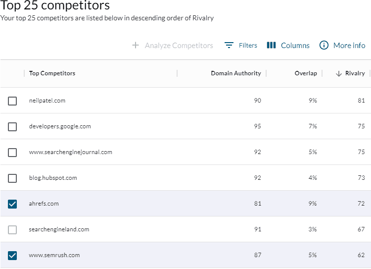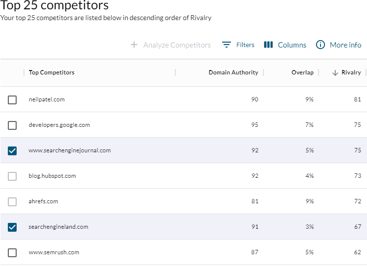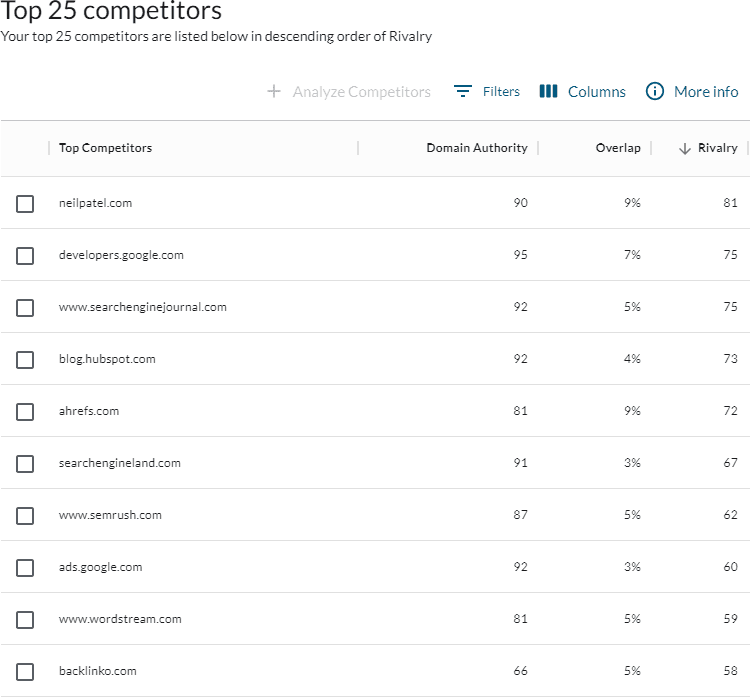 That’s where Rivalry comes in. Rivalry factors in the Click-Thru Rate (CTR) and volume of overlapping keywords, the target site’s ranking (keywords where the target ranks higher are more likely to be relevant), and the proximity of the two sites’ DA scores to help you sort which competitors are the most relevant and realistic.